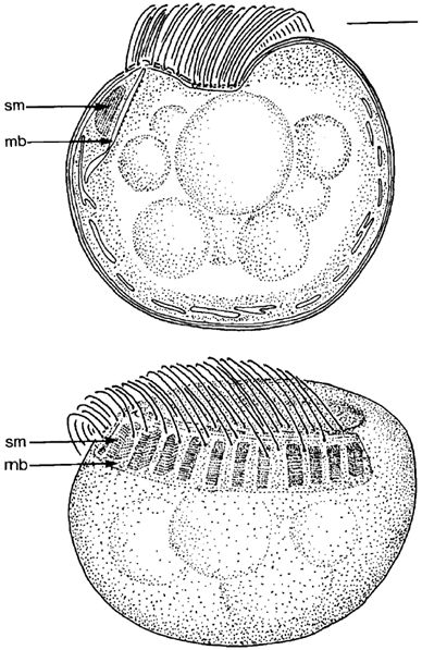 图中展示了微生物促动卵杆菌的横切面(上图)和侧视图(下图)。可见其长有一束由约400根鞭毛组成的“尾巴”,它正是借此来实现高速游动。(此外,它还拥有一些用途尚不明确的独特膜结构,包括堆叠膜(sm)和膜带(mb)。)图片来源:T. FENCHEL & R. THAR / FEMS MICROBIOLOGY ECOLOGY 2004